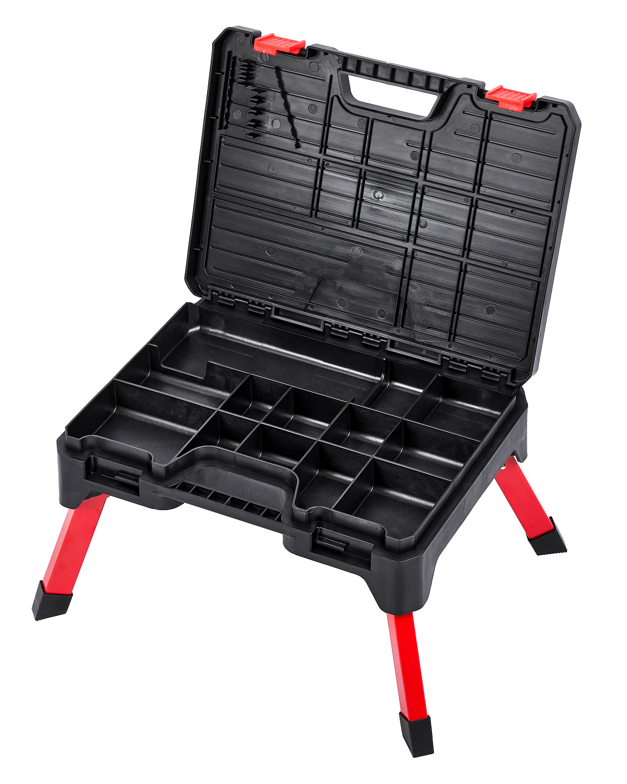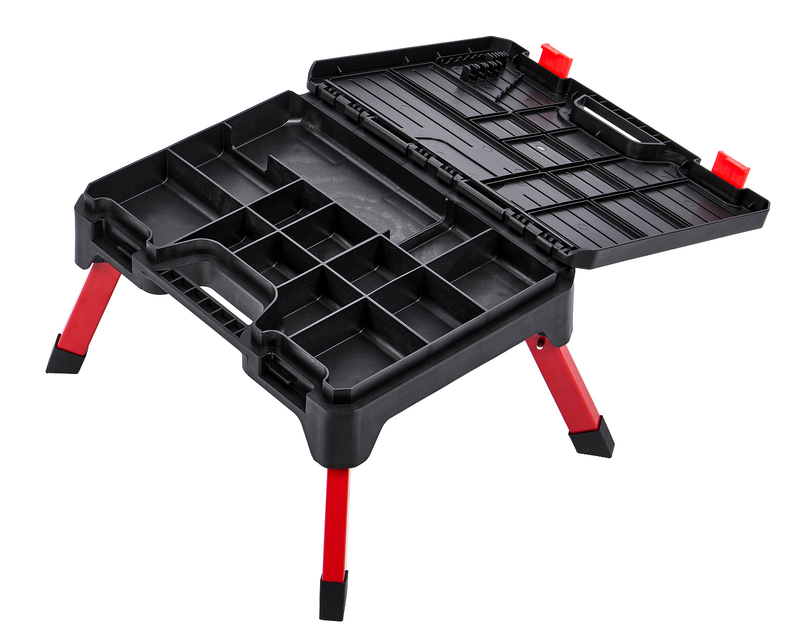 Раскладные ножки позволяют использовать табурет как подставку с высотой ступени 23,4 см и максимальной нагрузкой 150 кг. Органайзер применяется для хранения инструмента, метизов, крепежа.
