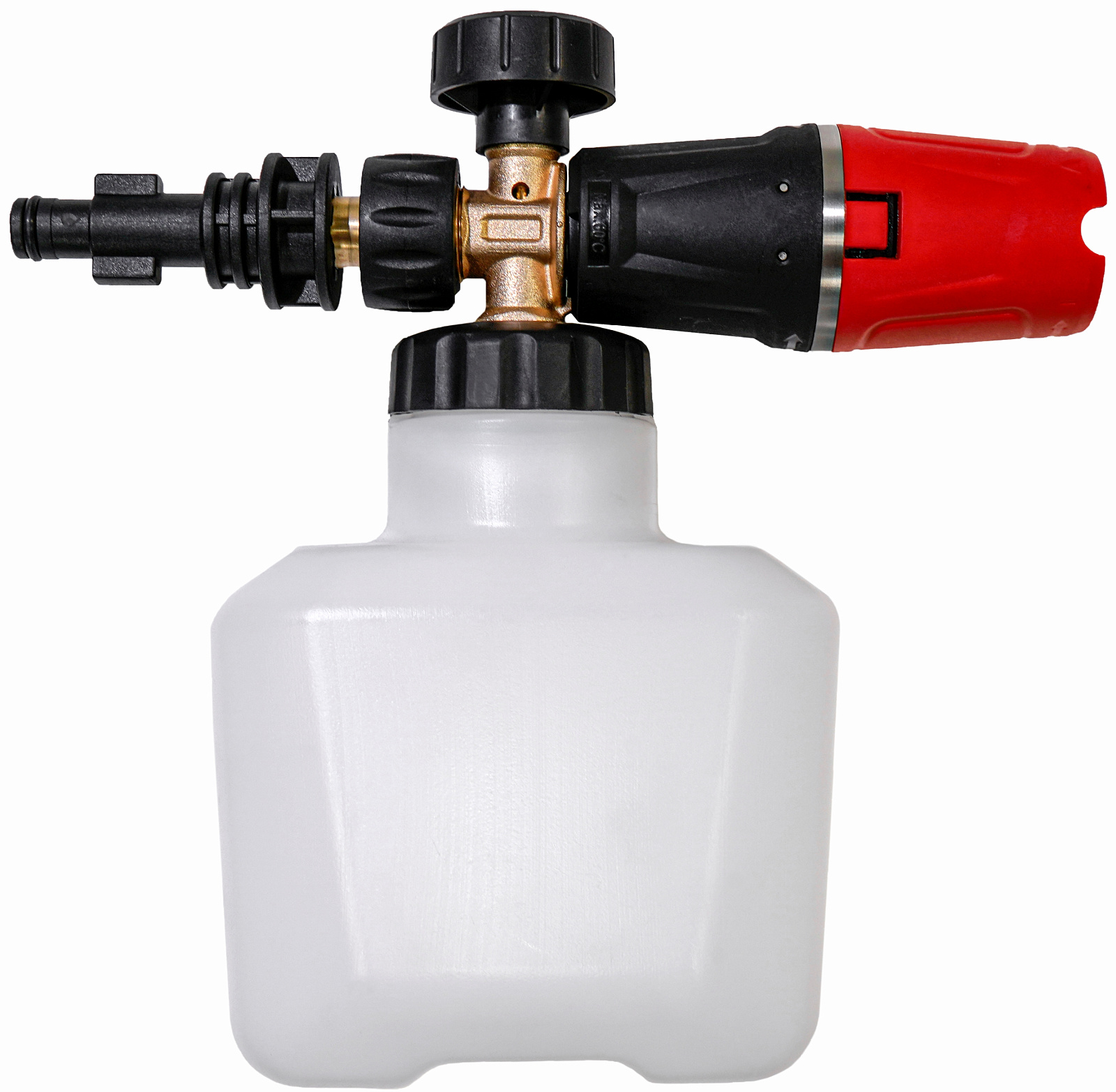 Пеногенератор с пластиковым бачком на 1 литр и регулируемой форсункой и массой 0,4 кг, используется для создания пенного водного раствора для бесконтактной очистки загрязненных поверхностей.