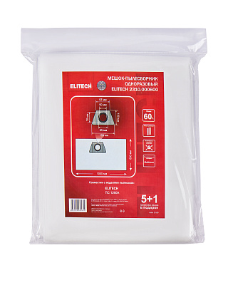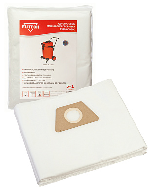 Пылесборник одноразовый ELITECH 2310.000600 для пылесоса ELITECH ПС 1260А, в комплекте 5 шт. Трехслойные синтетические, обладают длительной наполняемостью, могут использоваться для уборки влажного мусора. Не имет аналогов в России и зарубежом. • Фильтровальный материал Meltblown • Суперстойкий соединительный шов • Увеличенный объем • Устойчивость к высоким нагрузкам.