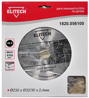 Диск пильный ELITECH 1820.056100 O230x32/30x2.4мм, 48 зуб. Обладает кольцом, меняющим диаметр посадки с 32 мм на 30 мм.
