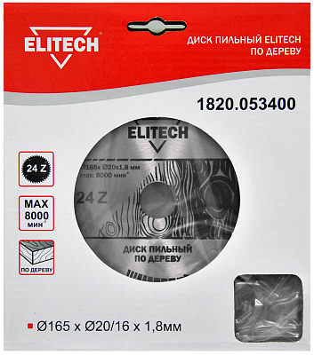 Диск пильный ELITECH 1820.053400 O165x20/16x1.8мм, 24 зуб. Обладает кольцом, меняющим диаметр посадки с 20 мм на 16 мм.