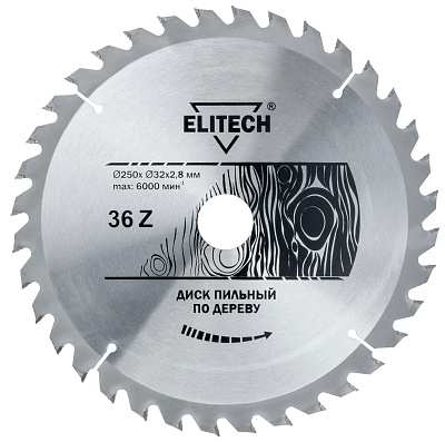 Диск пильный ELITECH 1820.056400 O250x32/30x2.8мм, 36 зуб. Обладает кольцом, меняющим диаметр посадки с 32 мм на 30 мм.