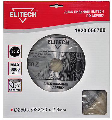 Диск пильный ELITECH 1820.056700 O250x32/30x2.8мм, 80 зуб. Обладает кольцом, меняющим диаметр посадки с 32 мм на 30 мм.
