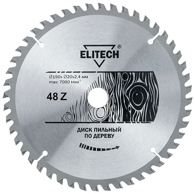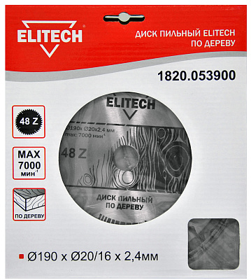 Диск пильный ELITECH 1820.053900 O190x20/16x1.8мм, 48 зуб. Обладает кольцом, меняющим диаметр посадки с 20 мм на 16 мм.