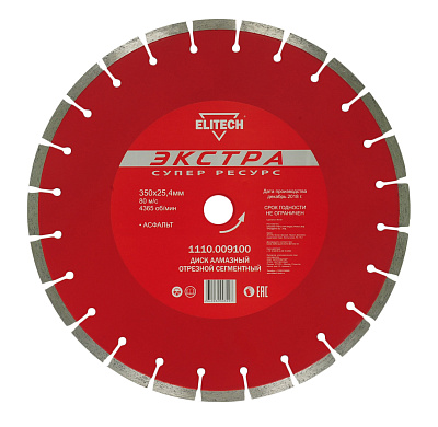 Сегментированный алмазный диск ELITECH 1110.009100 применяется для резки асфальта. При выборе диска важно обратить внимание на материал связки, который подбирается в зависимости от твердости и абразивных свойств обрабатываемого материала. Обеспечивает максимальную производительность. Обладает повышенным ресурсом.