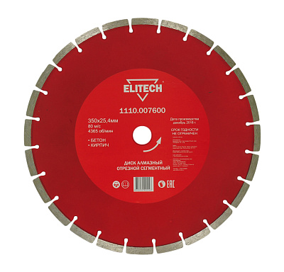 Сегментированный алмазный диск ELITECH 1110.007600 применяется для резки бетона, кирпича. При выборе диска важно обратить внимание на материал связки, который подбирается в зависимости от твердости и абразивных свойств обрабатываемого материала. Обеспечивает максимальную производительность.