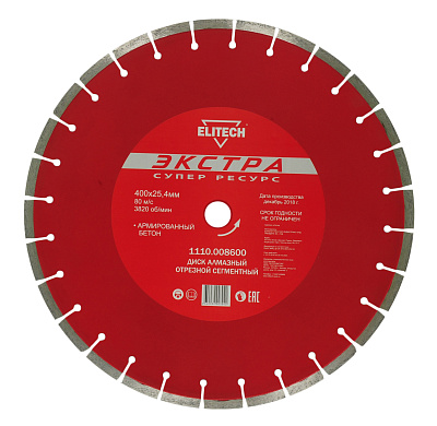 Сегментированный алмазный диск ELITECH 1110.008600 применяется для резки армированного бетона. При выборе диска важно обратить внимание на материал связки, который подбирается в зависимости от твердости и абразивных свойств обрабатываемого материала. Обеспечивает максимальную производительность. Обладает повышенным ресурсом.