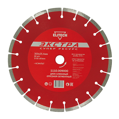 Сегментированный алмазный диск ELITECH 1110.009000 применяется для резки асфальта. При выборе диска важно обратить внимание на материал связки, который подбирается в зависимости от твердости и абразивных свойств обрабатываемого материала. Обеспечивает максимальную производительность. Обладает повышенным ресурсом.