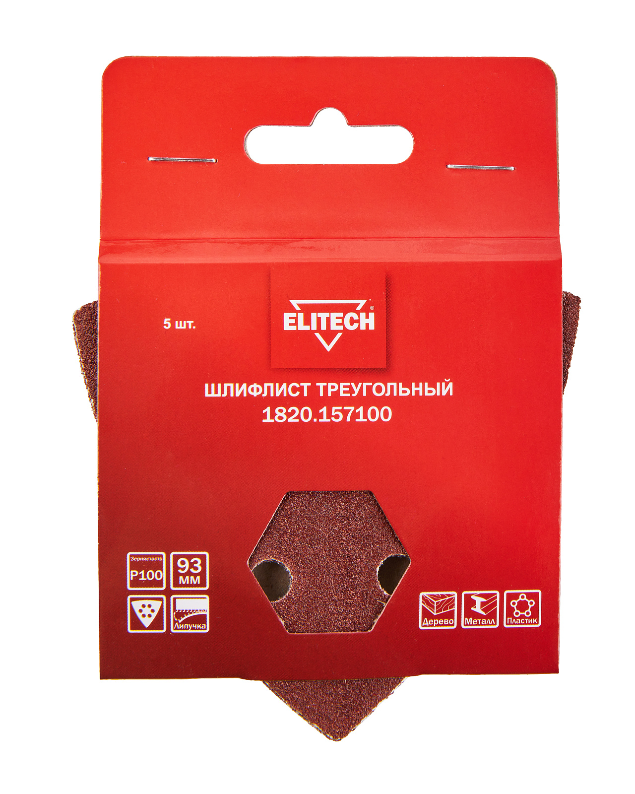 Шлифлист треугольный ELITECH 1820.157100. Предназначен для шлифовки деревянных, металлических, пластиковых поверхностей. Закрепляется с помощью 'липучки' на дельта-подошве многофункционального инструмента (МФУ).