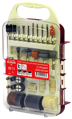 Набор для прямой микрошлифмашины 1820.001300 Набор 71 предмет: Оправка для полировального круга - 1шт Оправка для отрезного круга - 1шт Оправка для шлифовальных колец - 2шт Фрезерное сверло – 1 шт Фигурная шарошка – 4 шт Стальная кардщетка – 2 шт Абразивная шарошка – 4 шт Цанги 2,4 и 3,2 мм Абразивное шлифовальное кольцо – 4 шт Конусный полировальный круг – 1 шт Плоский полировальный круг 1/2' – 8 шт Плоский полировальный круг 1' – 4 шт Полировальная паста – 1 шт Отрезной абразивный круг – 36 шт