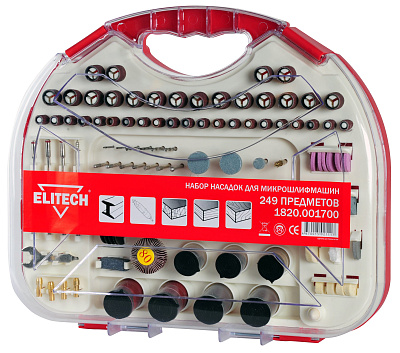 Набор для прямой микрошлифмашины 1820.001700 Набор 249 предметов: Оправка для полировального круга – 1 шт Оправка для отрезного круга – 3 шт Оправка для шлифовальных колец – 2 шт Абразивное шлифовальное кольцо (большое) – 18 шт Абразивное шлифовальное кольцо (малое) – 21 шт Полировальный круг 1/2'x1/4' – 4 шт Полировальный круг 1'x1/4' – 1 шт Тряпичный полировальный круг – 1 шт Фетровый полировальный круг – 1 шт Прорезиненный шлифовальный круг – 2 шт Лепестковый круг 3/8'x3/4' – 1 шт Шлифовальный лист – 60 шт Отрезной абразивный круг 1мм – 30 шт Отрезной абразивный круг 0.8mm – 36 шт Полировальная паста – 2 шт Отрезной круг из стекловолокна – 5 шт Фигурная шарошка – 8 шт Фрезерное сверло – 2 шт HSS сверло – 6 шт Шлифовальный круг – 18 шт Абразивное шлифовальное кольцо – 12 шт Правильный камень – 1 шт Цанга – 4 шт Латунная кардщетка – 3 шт Стальная кардщетка – 3 шт Нейлоновая кардщетка – 3 шт Ключ – 1 шт