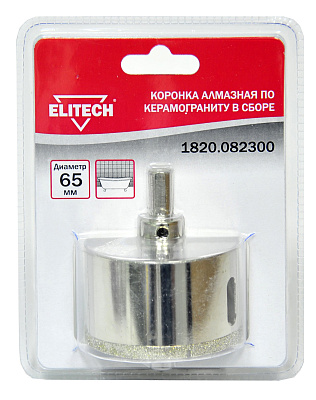 Коронка алмазная по керамограниту в сборе ELITECH 1820.082300, 65 мм.