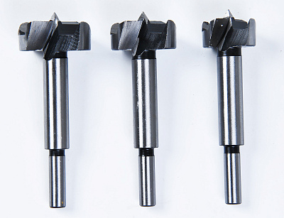 - Небольшой наконечник и плоская форма рабочей части позволяют сверлить глухие отверстия. Чаще всего эта группа изделий применяется для врезки мебельных петель, самые востребованные в этом случае варианты имеют диаметр 32 и 35 мм.