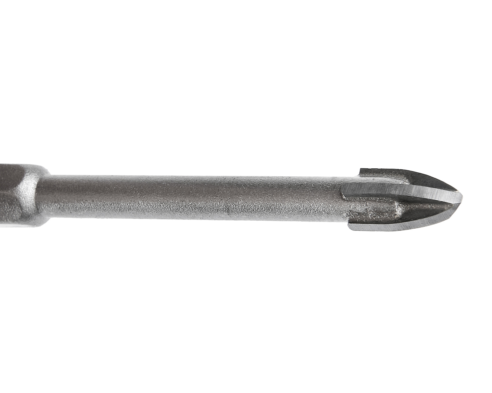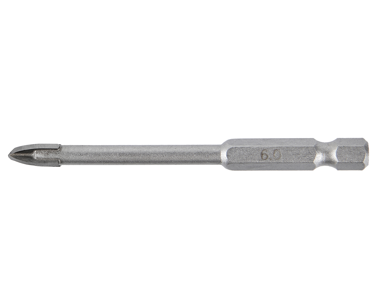 Для сверления отверстий в кафельной плитке и стекле используются сверла с твердосплавом крестовидной формы (в виде наконечника копья или стрелы) с острой кромкой. Такая форма пластины облегчает засверливание и прохождение верхнего защитного слоя на плитке. Для исключения повреждения материала сверление нужно проводить в безударном режиме и с небольшой скоростью, то есть нужно использовать сетевую дрель с пониженной скоростью вращения или аккумуляторную дрель.,