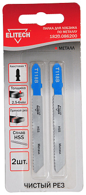 Пилка для лобзика (полотно пильное) ELITECH 1820.086200. Зубья позволяют выполнять чистый пропил (T118В).