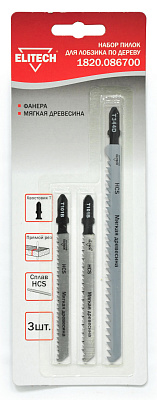 Набор из 3-х пилок для лобзика ELITECH 1820.086700. В наборе: • T344D, 135 мм - 1 шт.; • T101B, 75 мм, 2 шт.