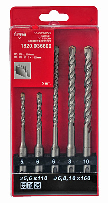 Набор буров ELITECH 1820.036600 предназначен для сверления отверстий в бетоне, кирпичной кладке с помощью перфораторов, имеющих тип крепления SDS-plus.