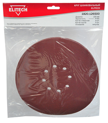 Круг шлифовальный ELITECH 1820.126500 для шлифмашины ELITECH МШС 1923Э ( E2213.003.01) на липучке, 8 отверстий. В комплекте 5 штук.