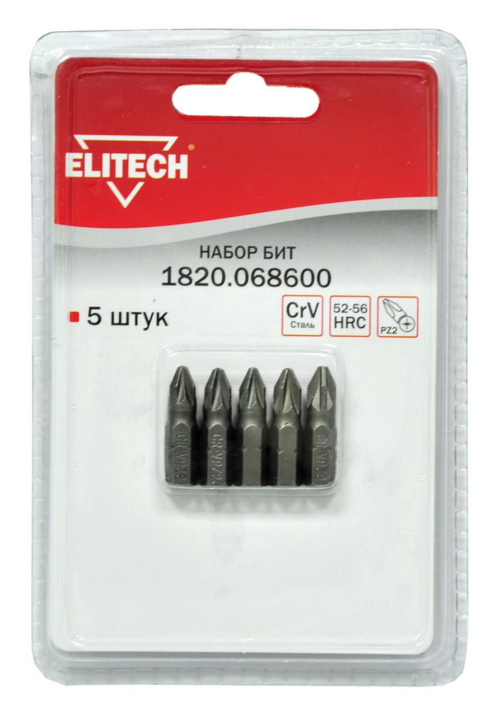 Набор бит ELITECH 1820.068600, CrV, 5 штук, блистер, PZ2 x 25мм.