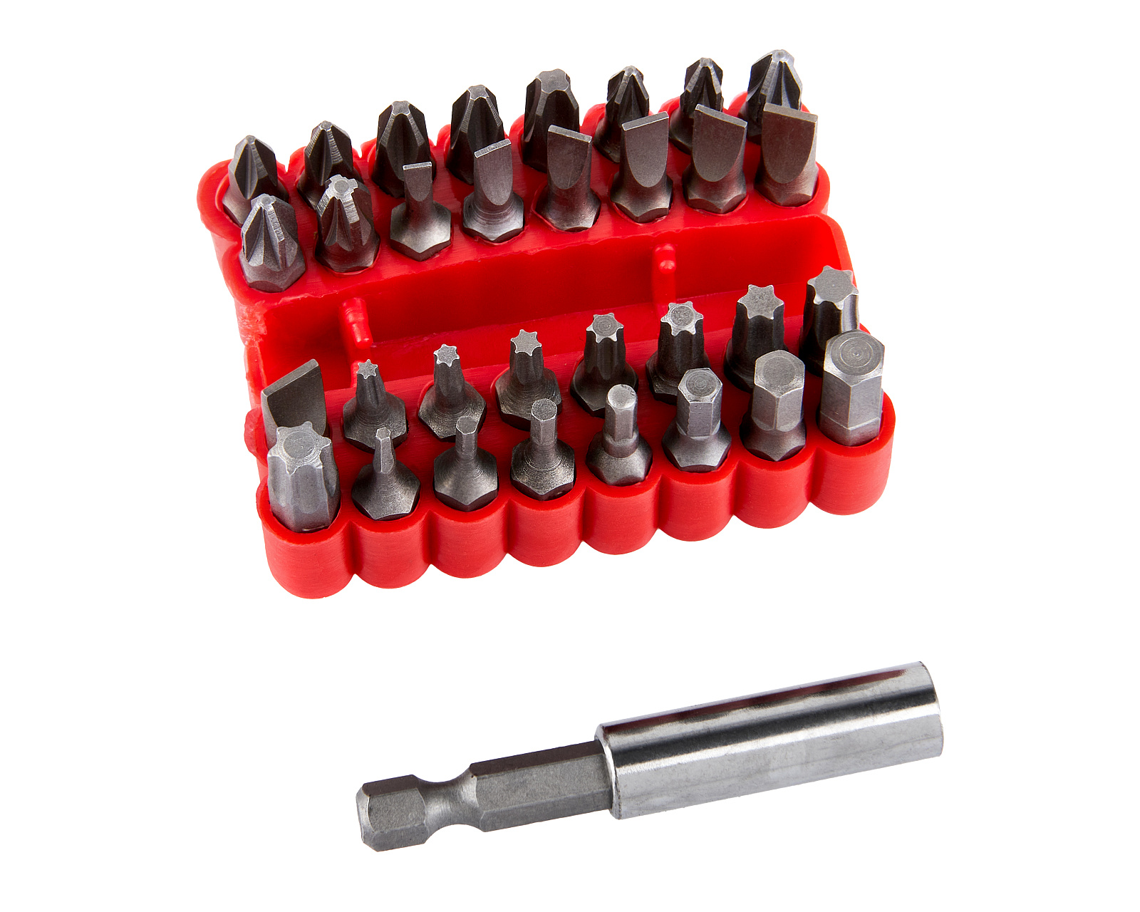 Набор из 32 бит длиной 25 мм из хромованадиевой стали и магнитного держателя применяется при монтаже и демонтаже различных конструкций и деталей.