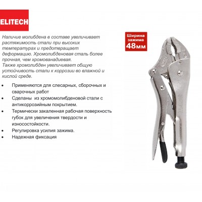 ELITECH Клещи зажимные ELITECH 520101. Предназначены для сжатия деталей и заготовок. Инструмент устойчив к высоким нагрузкам. Рабочий ход клещей составляет 38 мм.