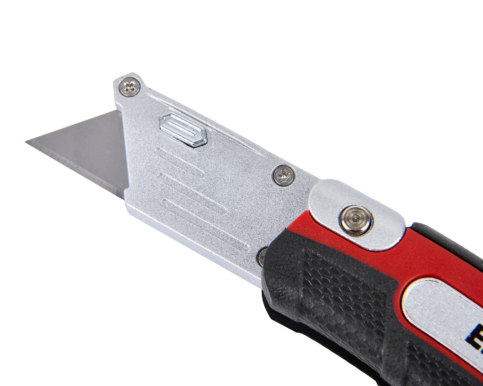 Строительный складной нож с трапециевидным лезвием и рукояткой из цинкового сплава с TPR-покрытием. Японская сталь SK5. 3 лезвия в комплекте – 1 в корпусе и 2 в отсеке хранения.