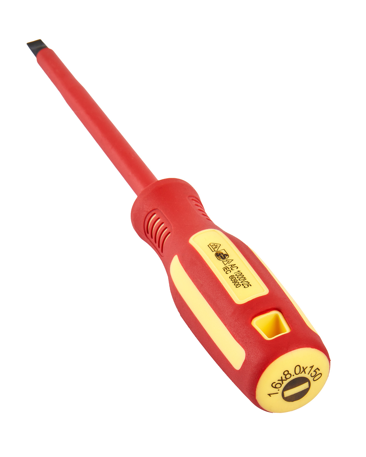 Отвертка диэлектрическая SL8,0x150мм из стали S2 с магнитным наконечником, применяется для работы с крепежом под напряжением до 1000 В.