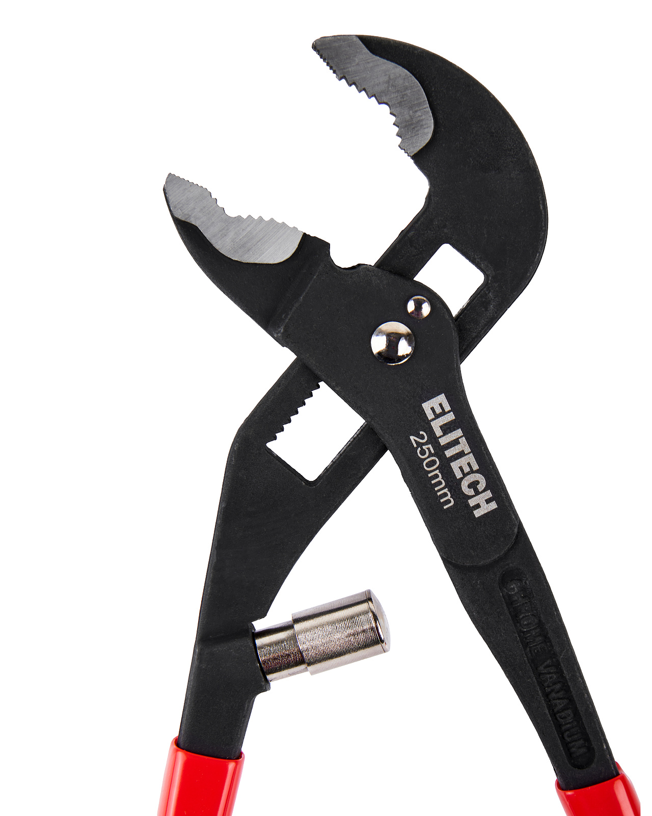 Переставные клещи длиной 250 мм из хромованадиевой стали, с механизмом автоматического регулирования зажима губок обеспечивают быструю и надежную фиксацию детали размером до 40 мм.