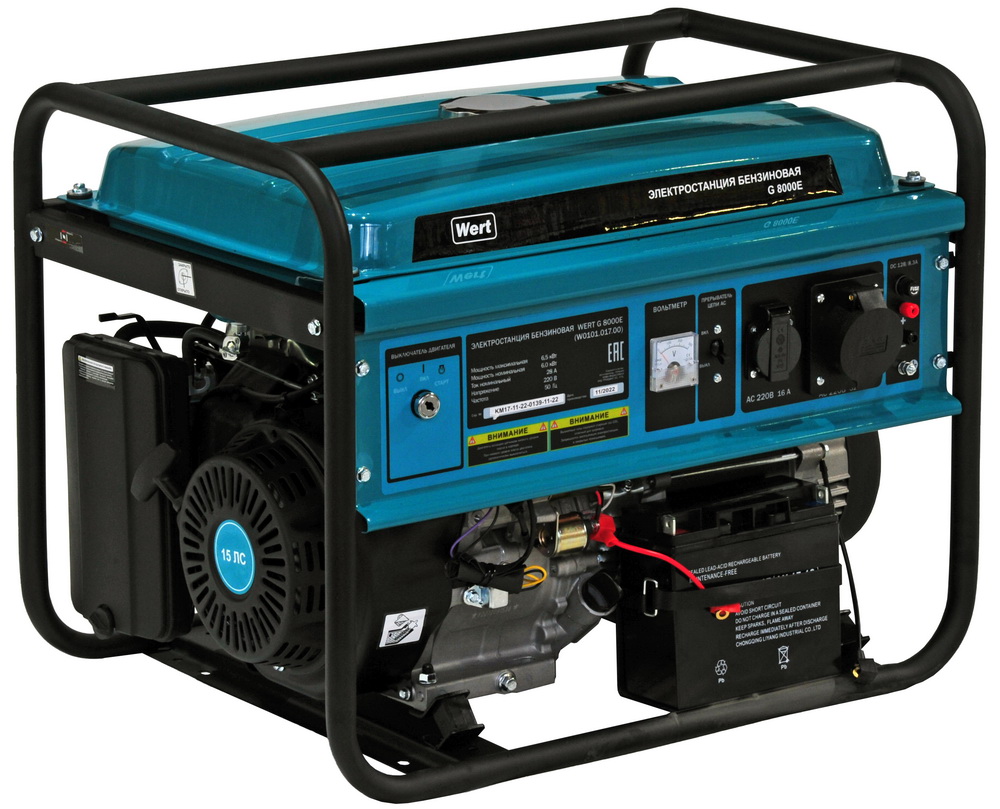 Электростанция G 8000Е (W0101.017.00) с четырехтактным бензиновым двигателем. Однофазная. Номинальная мощность 6 кВт. Одна розетка 220В/16А.Одна розетка 220В/32А. Электростартер.