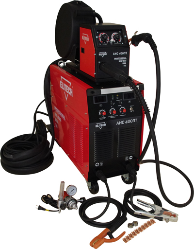 ОБЛАСТЬ ПРИМЕНЕНИЯ: Сварочный полуавтомат Elitech АИС 400ПТ идеально подходит для постоянных и интенсивных работ на промышленных производственных объектах (кораблестроение, вагоностроение и т.п.), в том числе и в нефтегазодобывающем, нефтеперерабатывающем, химическом и металлургическом секторах. ПРЕИМУЩЕСТВА: • ПРЕДЕЛЬНО ВЫСОКАЯ ПРОИЗВОДИТЕЛЬНОСТЬ - Рабочий цикл при максимальной силе тока составляет 100%, что ПОЗВОЛЯЕТ ИСПОЛЬЗОВАТЬ АППАРАТ БЕЗ ПЕРЕРЫВА В ТЕЧЕНИИ СУТОК, РАБОТАЯ В 3 СМЕНЫ !!! • УНИВЕРСАЛЬНОЕ ИСПОЛЬЗОВАНИЕ (3 ВИДА СВАРКИ) – Аппарат предназначен для использования ручной дуговой сварки плавящимся электродом ММА; для полуавтоматической сварки плавящейся проволокой MIG/MAG и аргонодуговой сварки неплавящимся электродом TIG на постоянном токе. • ЦИФРОВОЙ ДИСПЛЕЙ – Дает возможность с высокой точностью устанавливать необходимый сварочный ток и напряжение дуги. ФУНКЦИИ: • БЫСТРОРАЗЪЕМНОЕ СОЕДИНЕНИЕ СВАРОЧНЫХ КАБЕЛЕЙ – Позволяет за несколько секунд подсоединить к аппарату кабель со сварочной горелкой и кабель с зажимом массы, без использования каких-либо инструментов. • ФУНКЦИЯ «HOT START» - Обеспечивает лёгкое разжигание сварочной дуги.