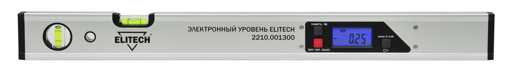 Уровень электронный ELITECH 2210.001300: • Цифровой дисплей; • Алюминиевый корпус; • Подсветка дисплея; • Память одного значения; • Автоматическое отключение; • Два пузырьковых уровня; • Магнитное основание; • В комплекте чехол и элементы питания.