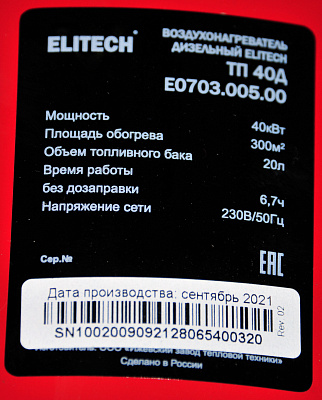 Дизельная тепловая пушка ELITECH ТП 40Д (E0703.005.00) прямого нагрева. Тип топлива дизельное. Работает от сети питания 230В. Предназначена для работы в нежилых помещениях с приточно-вытяжной вентиляцией. Оснащена термостатом.