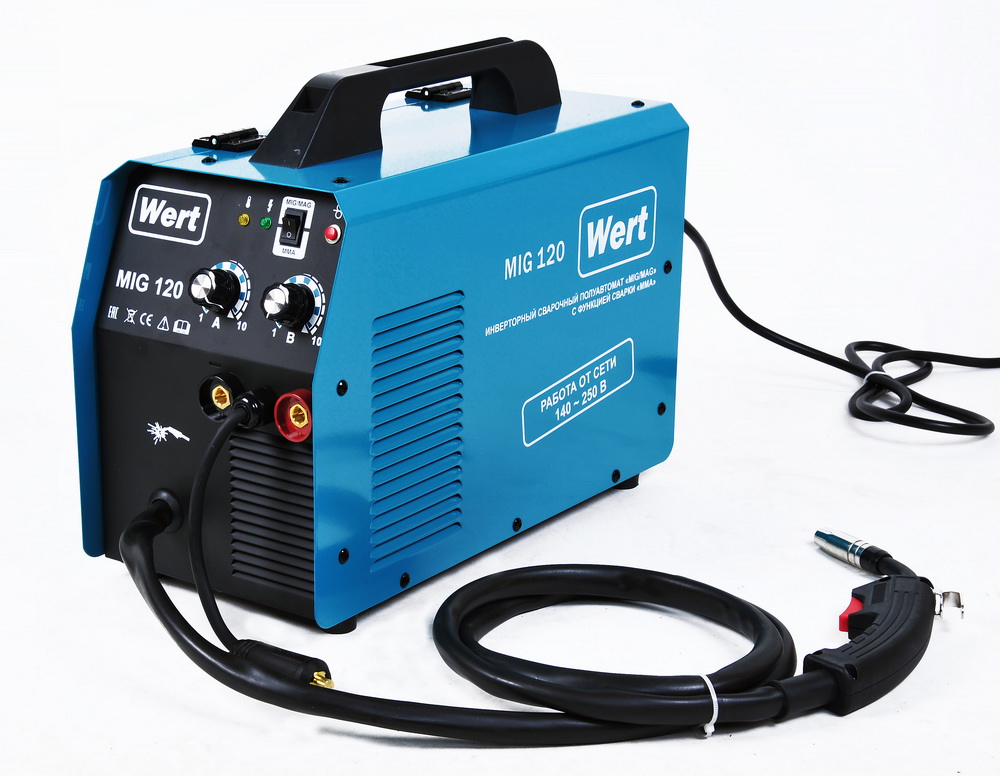 Инверторный полуавтомат WERT MIG 120 (W1701.001.00) создан по самой современной технологии «IGBT» c использованием мощных биполярных транзисторов с изолированным затвором. Плавная регулировка силы тока и напряжения на дуге дают возможность устанавливать наиболее подходящие значения для каждого конкретного случая. Аппарат отличается высоким качеством сварного шва, простотой эксплуатации и удобством обслуживания. Аппарат расчитан на катушку с проволокой до 5кг. Катушка с проволокой устанавливается в специальный отсек внутрь корпуса аппарата. Горелка MIG/MAG не съемная.