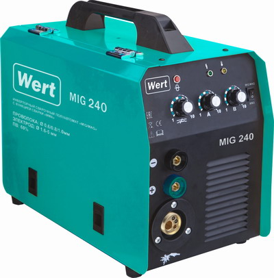Инверторный полуавтомат Wert MIG 240 создан по самой современной технологии «IGBT» c использованием мощных биполярных транзисторов с изолированным затвором. Плавная регулировка силы тока и напряжения на дуге дают возможность устанавливать наиболее подходящие значения для каждого конкретного случая. Аппарат отличается высоким качеством сварного шва, простотой эксплуатации и удобством обслуживания. Применяются для сварки сталей (в том числе нержавеющих) и алюминиевых сплавов.