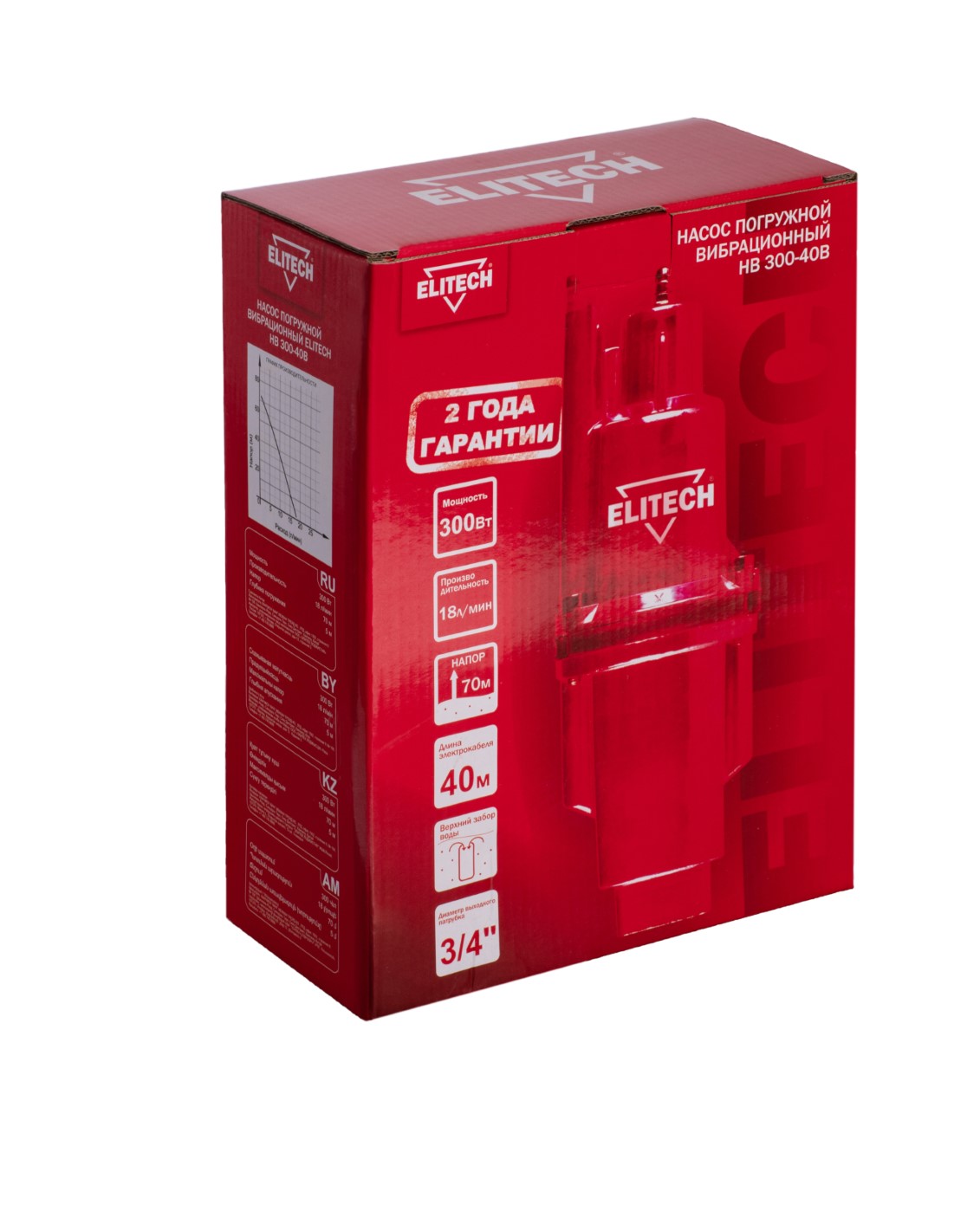 Насос погружной вибрационный ELITECH ВН 300-40В. Мощностью 300 Вт развивает максимальное эксплуатационное давление в 7 бар. Предназначен для подачи чистой пресной воды, с максимальной температурой не более 35°С, из колодцев, открытых водоемов и других источников. Насос оптимален для подачи воды из глубоких колодцев и скважин, в которых уровень воды стоит ниже 8 метров относительно поверхности земли. Максимальный напор насоса составляет 70 м. Насос не предназначен для перекачивания едких, легковоспламеняемых и взрывчатых веществ (нефть, бензин, растворители), а также масел, жиров и сточных вод.