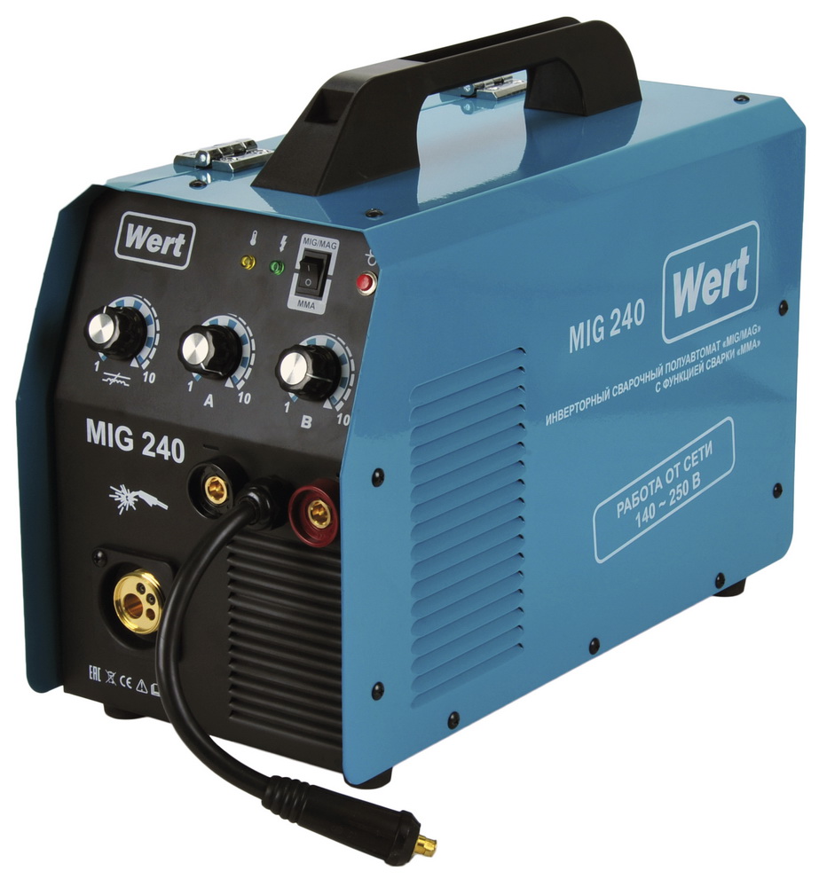 Инверторный полуавтомат WERT MIG 240 (W1701.004.00) создан по самой современной технологии «IGBT» c использованием мощных биполярных транзисторов с изолированным затвором. Плавная регулировка силы тока и напряжения на дуге дают возможность устанавливать наиболее подходящие значения для каждого конкретного случая. Аппарат отличается высоким качеством сварного шва, простотой эксплуатации и удобством обслуживания. Аппарат рассчитан на катушку с проволокой до 5кг. Катушка с проволокой устанавливается в специальный отсек внутрь корпуса аппарата. Горелка MIG/MAG съемная с ЕURO коннектором.