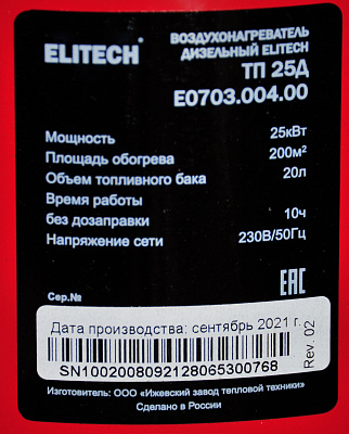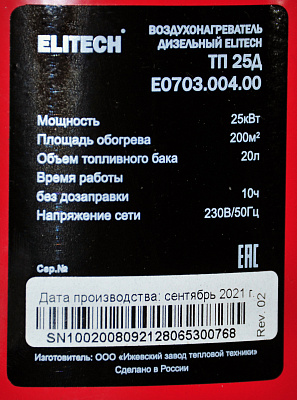 Дизельная тепловая пушка ELITECH ТП 25Д (E0703.004.00) прямого нагрева. Тип топлива дизельное. Работает от сети питания 230В. Предназначена для работы в нежилых помещениях с приточно-вытяжной вентиляцией. Оснащена термостатом.