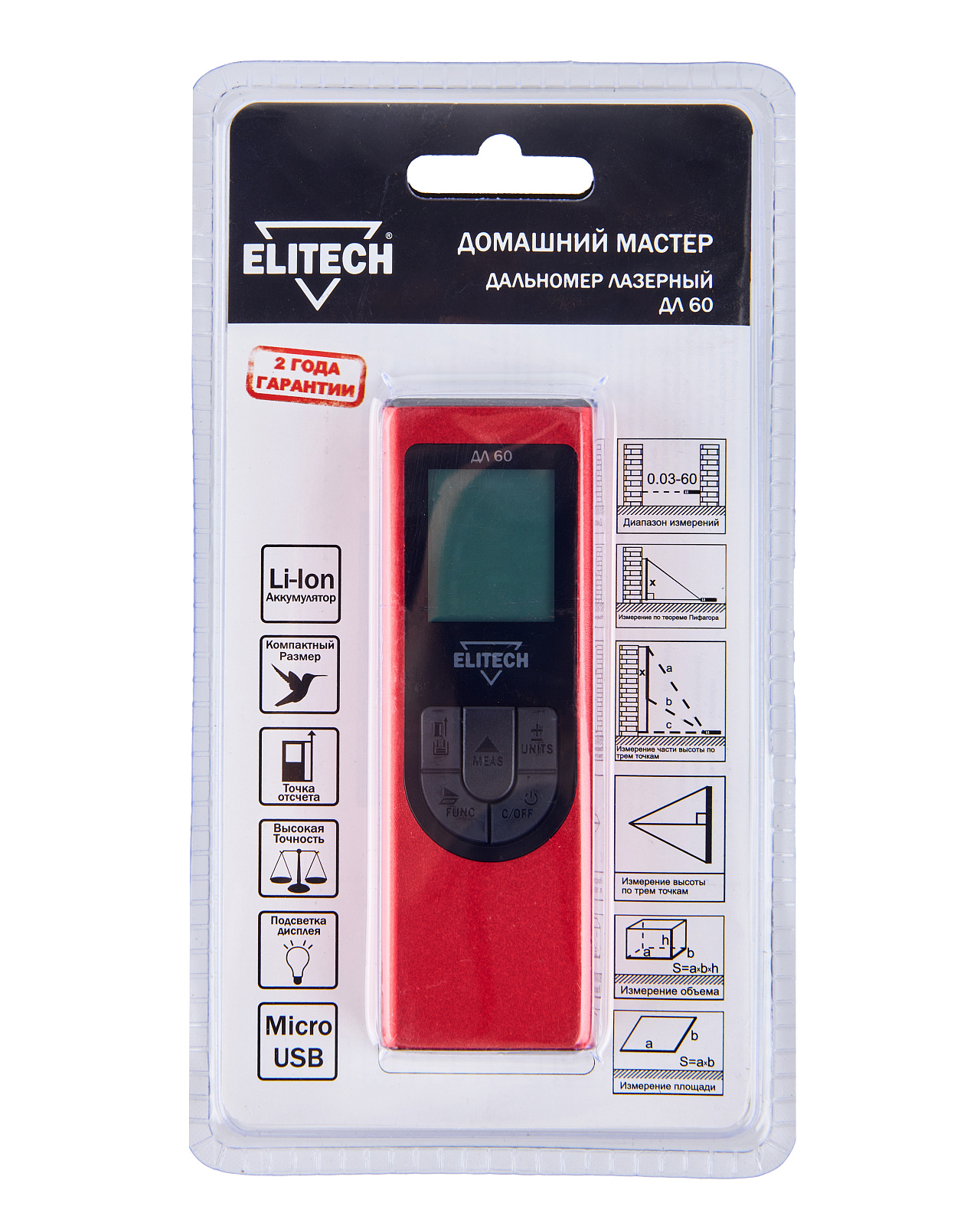 Лазерный дальномер ELITECH ДМ ДЛ 60 предназначен для быстрого измерения расстояний на дальности до 60 метров. Он точнее обычной рулетки при измерении расстояния более 8 метров. Дальномер имеет возможность производить косвенные вычисления (измерять высоту объекта) по теореме Пифагора, а также замеры площади и объема. В качестве начала измерения используется 2 точки отсчета – от передней кромки и от заднего края. Дисплей прибора имеет подсветку, что повышает удобство работы с прибором в условиях недостаточной освещенности. Прибор позволяет сохранить в памяти 20 значения измерений. Габариты 100х32х19 мм, масса 50 грамм.