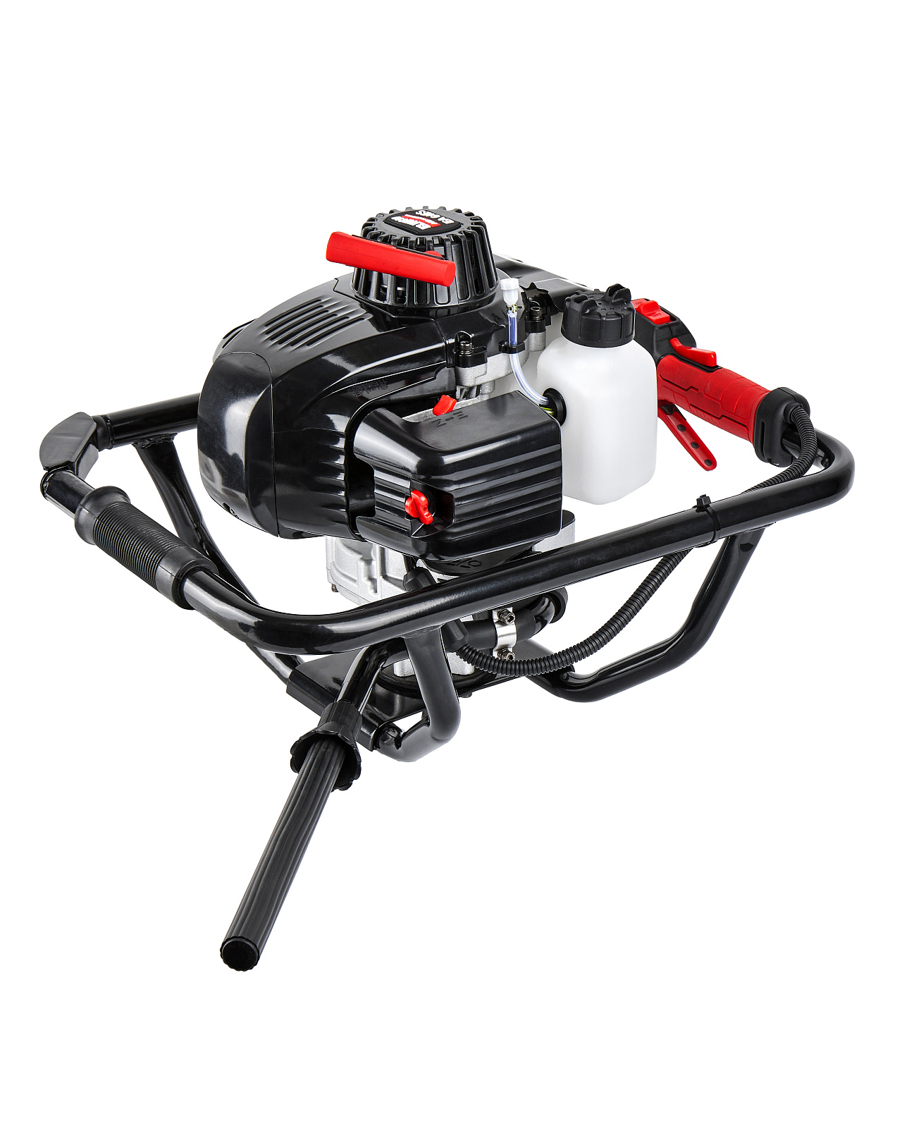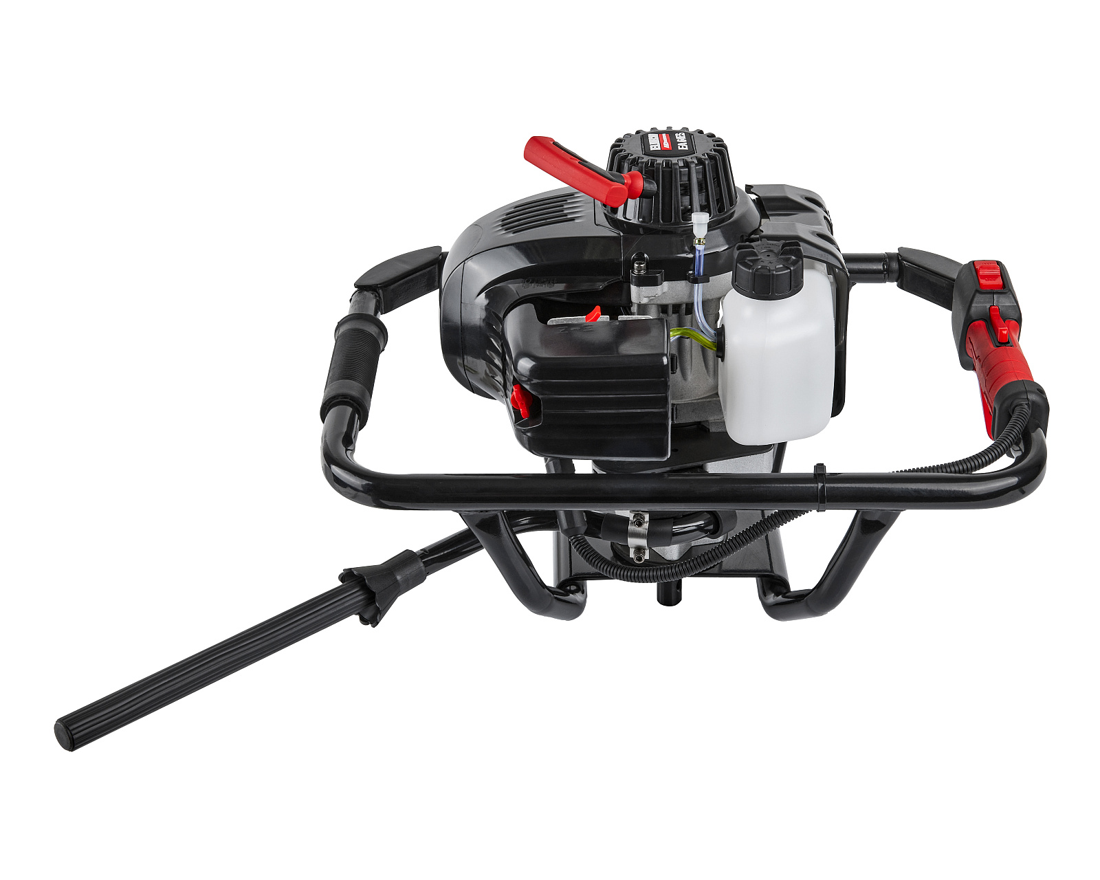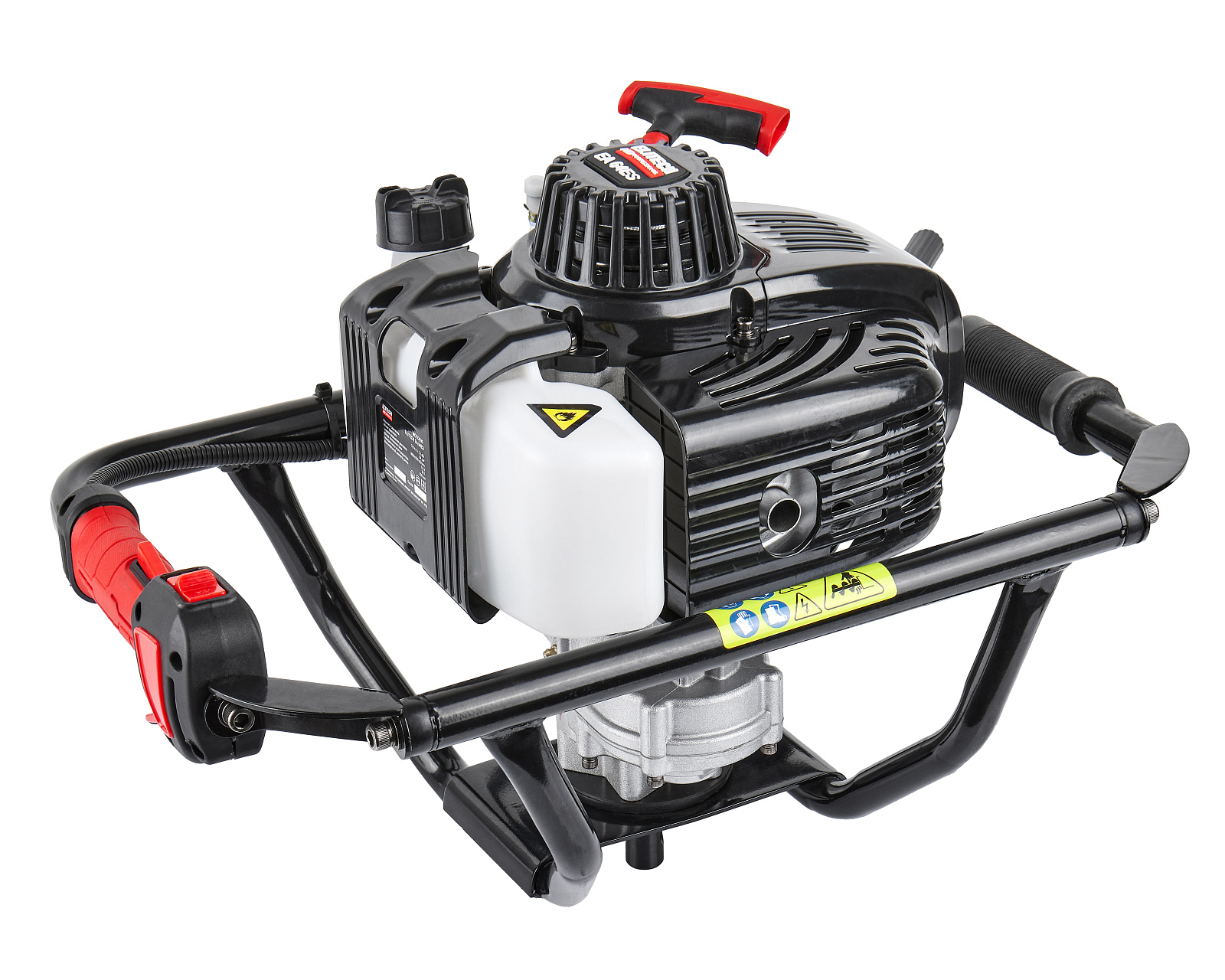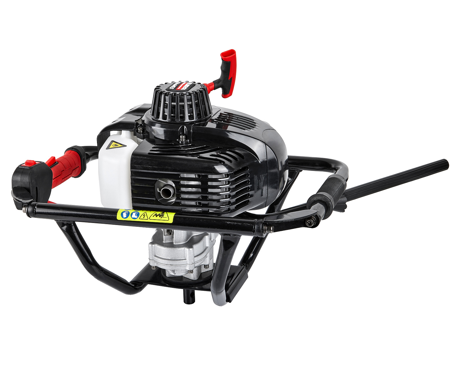 Бензиновый мотобур с двухтактным двигателем мощностью 3 л.с. (2,2 кВт) и передаточным числом редуктора 30 к 1, предназначен для бурения грунта и льда шнеком диаметром от 40 мм до 200 мм на глубину до 1,8 метров. При эксплуатации мотобура необходимо правильно выбрать тип шнека (для грунта, для мерзлого грунта или для льда). Шнеки для разных типов грунта отличаются режущей головкой.
