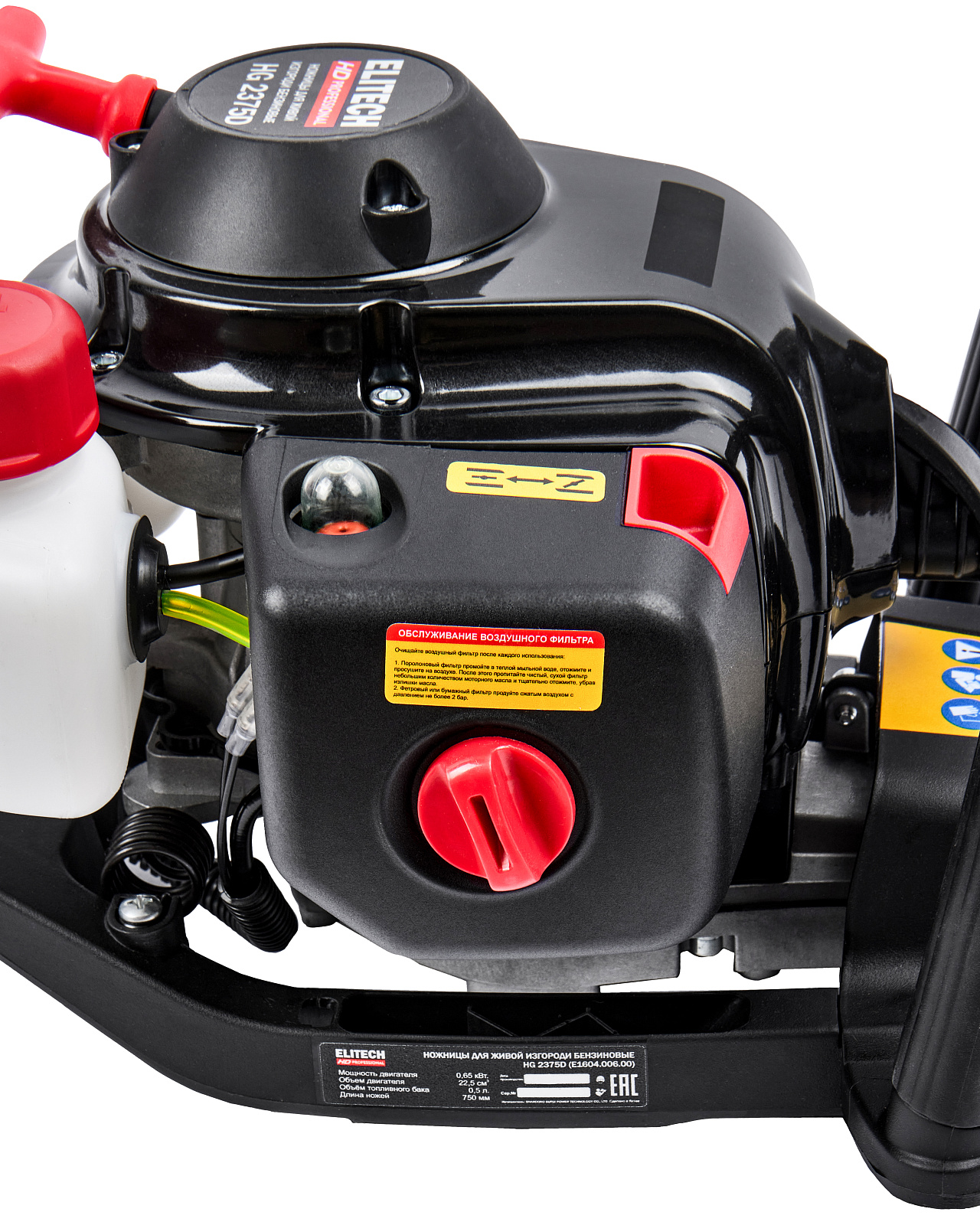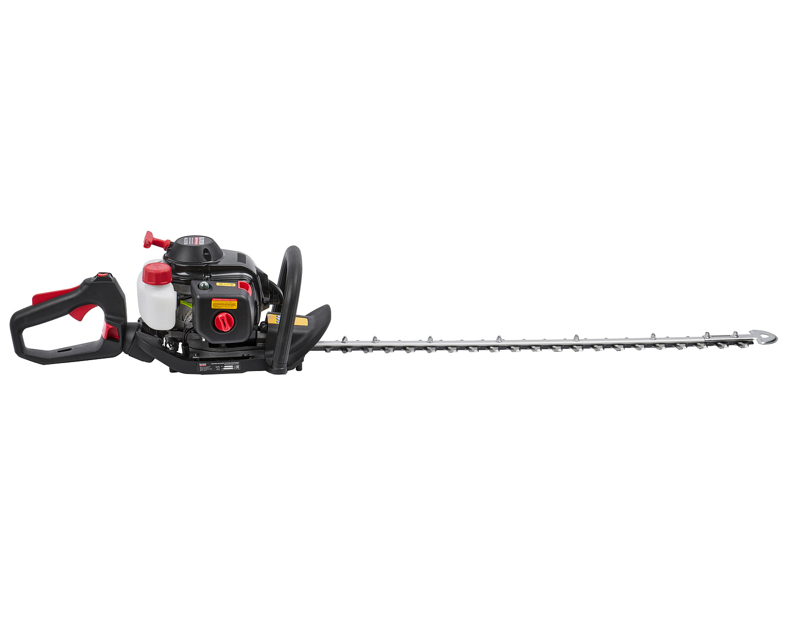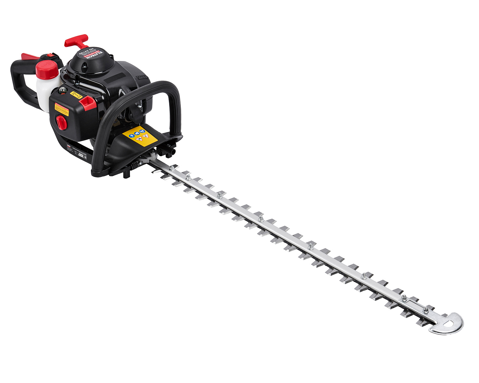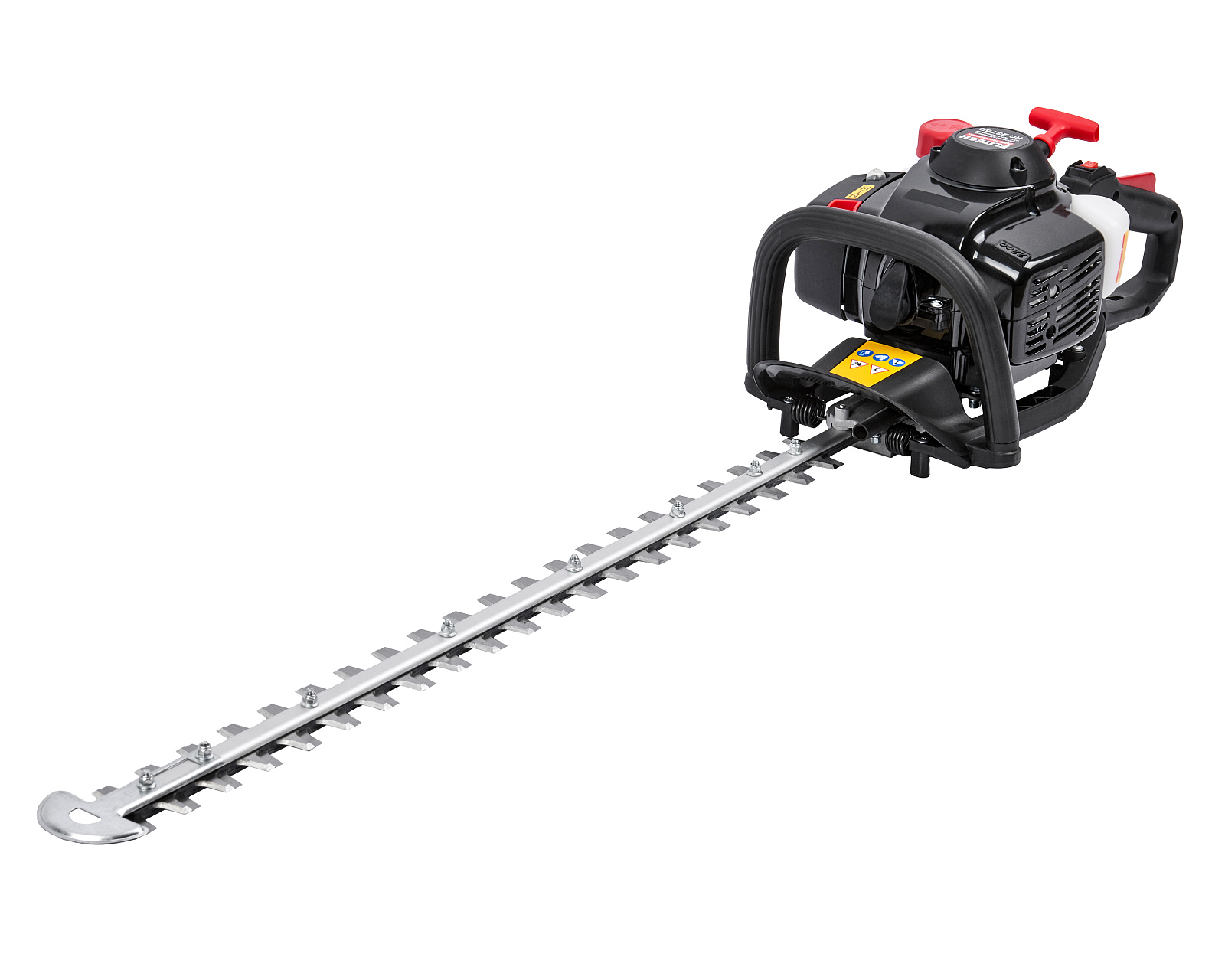 Бензиновые ножницы для живой изгороди мощностью 0,9 л.с. (0,65 кВт), эргономичной конструкции, с низкооборотистым двигателем современной конструкции, работающим на топливной смеси в пропорции 1:50, обеспечивающим высокий крутящий момент и длительный срок эксплуатации, с двухсторонними ножами длиной 750мм, с лазерной заточкой и поворотной задней рукояткой (5 положений).